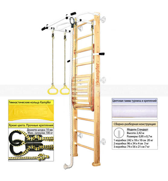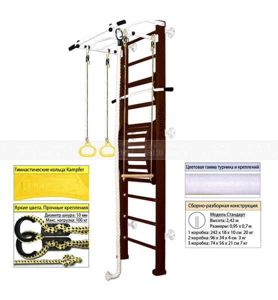 Комплектация: турник, шведская стенка, канат, кольца, трапеция, тренажер для спины Kampfer Posture с турником