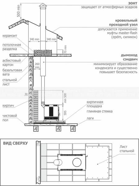 Небольшие габариты печи, в сочетании с особой углубленной конструкцией выхода дымохода, дают дополнительную экономию пространства и существенно расширяют возможности при монтаже печи: дымоход можно вывести как вверх, так и назад.