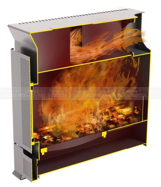 В печи реализована возможность поддержания тепла в режиме длительного горения — до 8 часов на одной закладке дров. Кожух-конвектор печи обеспечивает быстрый, равномерный нагрев помещения и защиту от жесткого инфракрасного излучения от стенок топки.