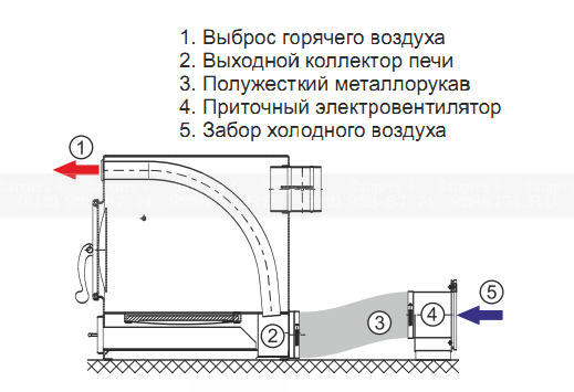 Встроенные конвективные теплообменные трубы увеличивают площадь поверхностей нагрева на 80%. Принудительный наддув электрическим вентилятором увеличивает скорость прохождения воздуха через теплообменные трубы в несколько раз, обеспечивая «турбореактивный» разогрев помещения.