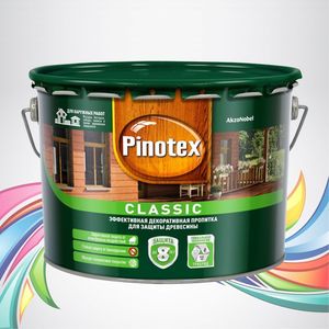 Pinotex Classic представляет собой прозрачную смесь водостойких и антисептических веществ (биоцидов) для предотвращения попадания влаги между волокнами древесины, ее гниения и заражения микроорганизмами. В основном применяется при наружных работах для комплексной защиты и окрашивания пиленых деревянных поверхностей (при необходимости можно наносить и на строганую), находящихся под прямым действием ультрафиолетового солнечного излучения и атмосферных осадков. Особенность и отличие этого средства состоит в возможности использовать его в комплексе с другими покрытиями (грунтовками) или же отдельно от них (глубоко пропитывает древесину, заменяя грунтовки).