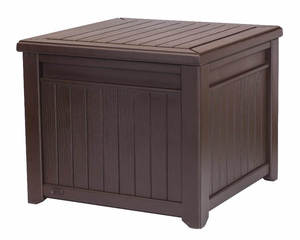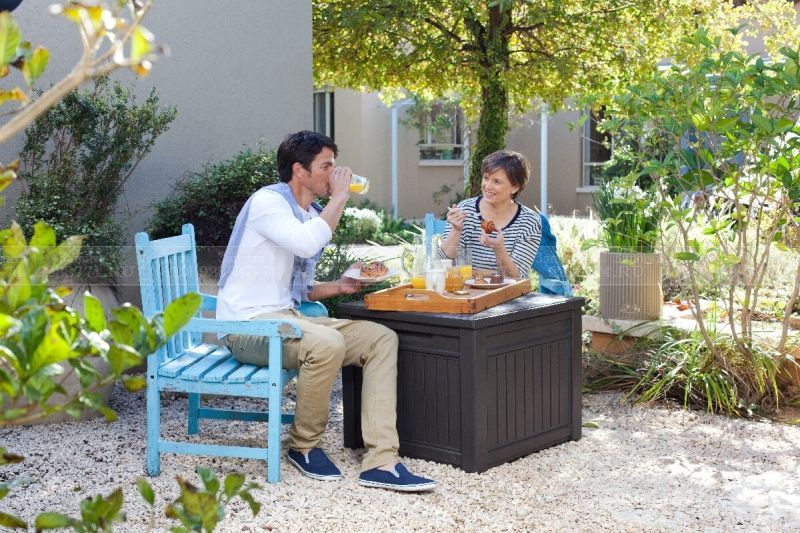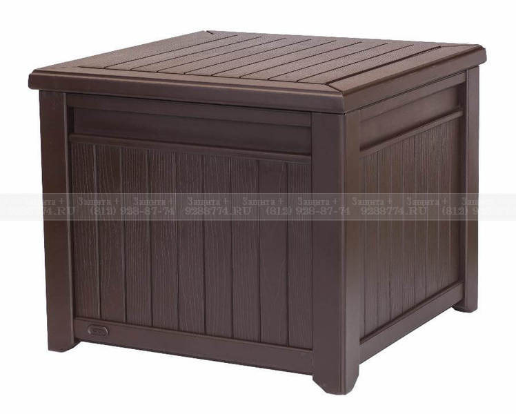 Квадратный сундук-столик вместимостью 208л с дизайном под деревянную обрешетку используется для уличного или домашнего хранения вещей. Он изготовлен из экологичного, чистого сырья - прочного, надежного пластика с добавлением в структуру анти-УФ защиты от выгорания и разрушения под воздействием атмосферных осадков и низких температур.
