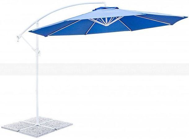 Предлагаемая модель зонта "Ареццо" диаметром 3,0м и высотой 2,8м с одной алюминиевой стойкой высотой 2,8м, сечением Ø48мм с 8-ю алюминиевыми ребрами жесткости размером 12х18мм, ткань зонта - полиэстер синего цвета плотностью 180 гр/м.кв. В комплект также входит крестовое металлическое основание и удобный механизм открывания/закрывания.