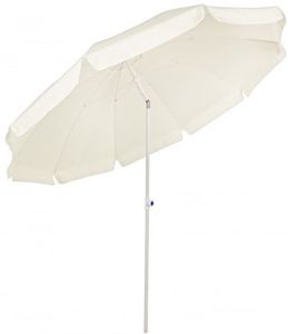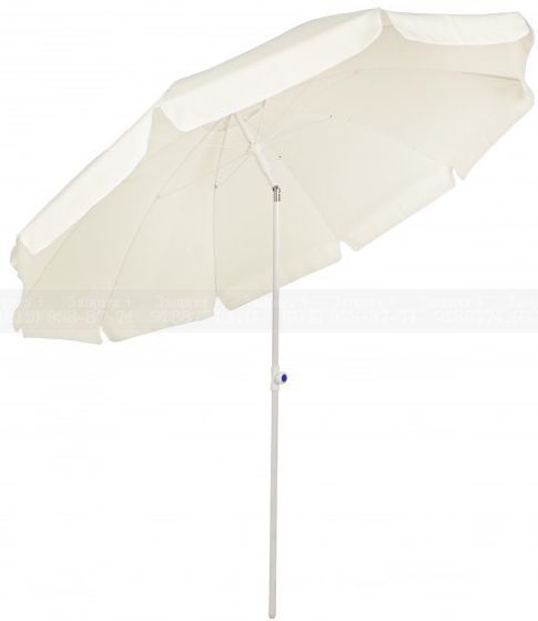 Предлагаемая модель зонта "Тревизо" диаметром 2,5м и высотой 2,2м с одной центральной опорой может располагаться как в центре столика, так и на открытом участке с закреплением в специальном основании с утяжелителем (бетонным блоком размером до 0,5х0,5м). Центральная наклоняемая металлическая стойка высотой 2,2м сечением Ø28мм/32мм, 10 спиц из стеклопластика 3,7мм, ткань зонта - полиэстер бежевого цвета плотностью 180 гр/м.кв. с вентиляцией.